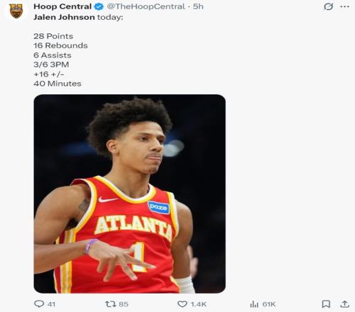 杰伦-约翰逊是新鹰王,他此役40分钟,24中11,三分6中3,罚球6中3,拿到28分16篮板6助攻1盖帽,命中率45.8%,三分命中率50%,但球队却没有给他最后一投设置战术。